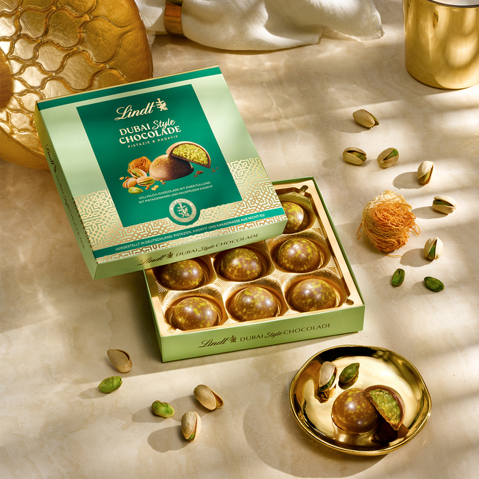 Filled milk chocolate with a pistachio-pastry threads filling (26%